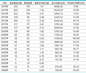 Wind数据统计,2010年之前,每家公募年均发行产品数量仅为1只;2010年~2014年,平均每家公募基金发行量已经是3.11只;2015年~2016年,基金家数超过百家,平均每家发行基金的数量高达7.57只。